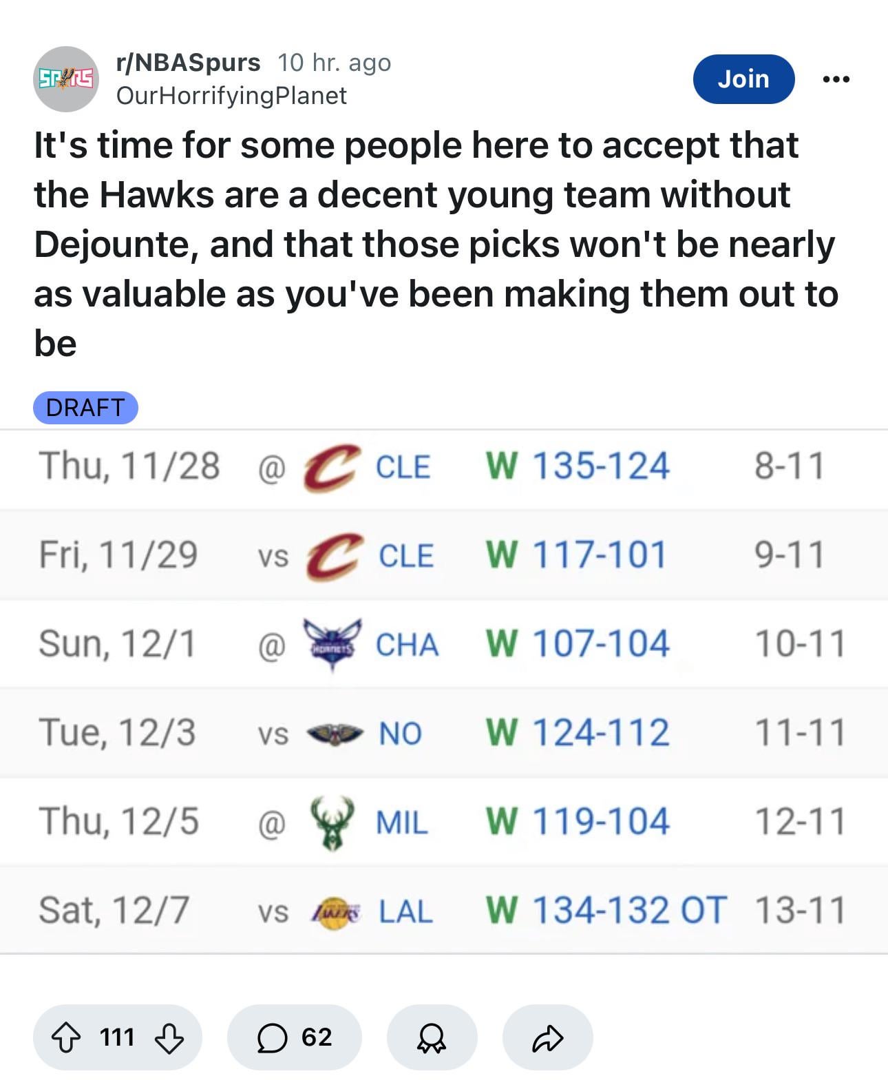 6 game winning streak, if things keep trending this way the pick we give the Spurs will be lower than their own AND we’ll still get a higher pick from the Lakers.