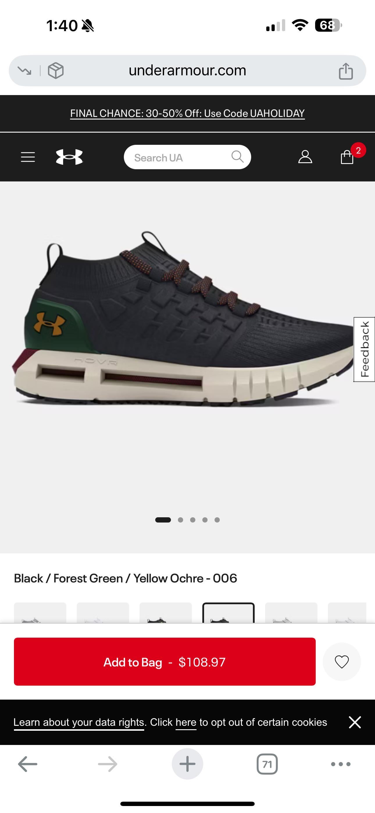 Wanted to share, as someone who likes to match my kicks to my jerseys, I was browsing the Under Armour site today and looks like they have a pair of kachina colored kicks. Reminded me of the kachina gloves. Using the code UAHoliday got them for 50% off and free shipping/returns so gonna check them out. Figured I’d share for any like minded folks. They’re the UA Phatom 1 on the black, Forrest green, yellow ochre 006 colorway. I’ll put a link in the comments as well.