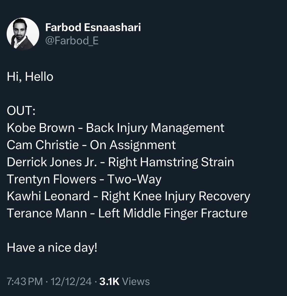 What’s the starting lineup looking like tomorrow?