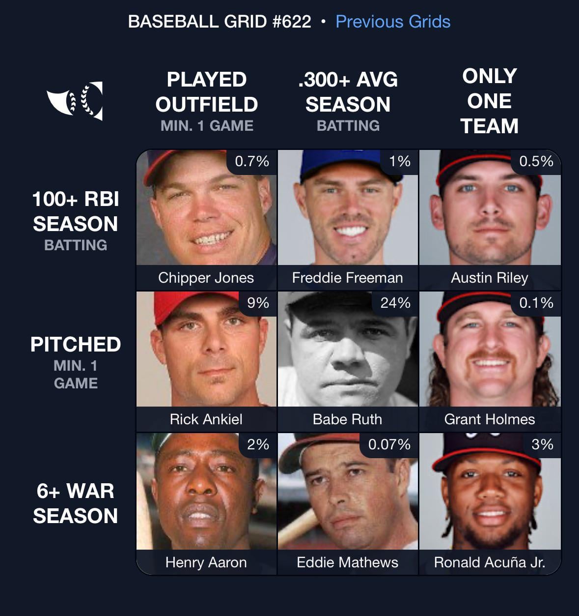 This was my first 9/9 using all Braves too, although I had the same middle square as you and that felt like cheating. I looked up after I was done and Charlie Culberson hit 1/1 in 2023, so he’d work in the middle but I used him for center left already.