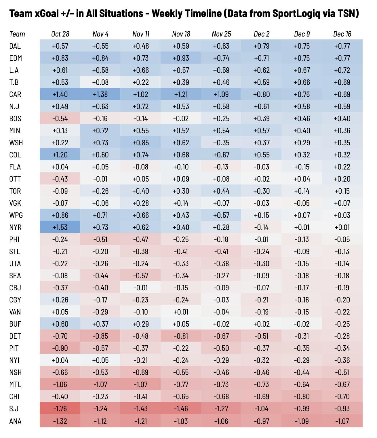 This has the Lightning with the fourth best expected goal differential in the league, and with continuous growth week over week since November 4th.