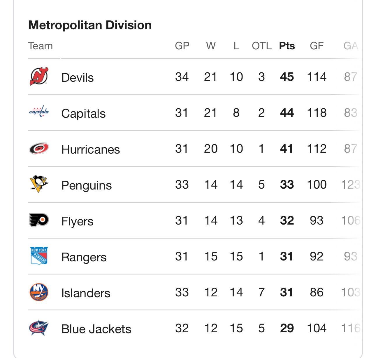 This is beautiful, back in first 2 comments Is there any site that lists the standings by points per game or something like win % to take out the disparity caused by different amounts of games played? Not that I want the devils out of first ignore that GP column, doesn’t matter 🙂 Leave a ReplyYou must be logged in to post a comment.