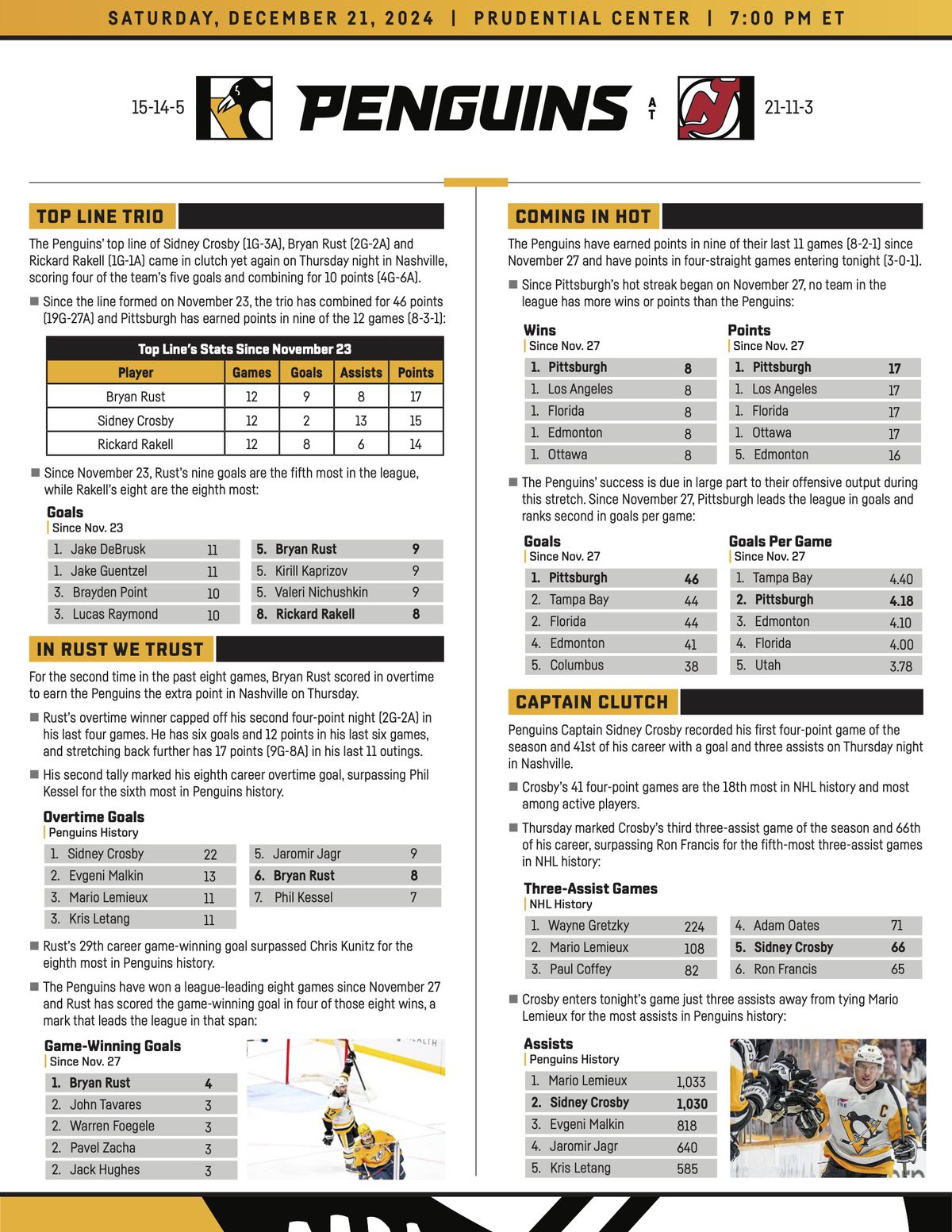 Season Series: This is the first of four meetings between the Pens and Devils, with home games coming up in February and March followed by another trip to Newark in April.
