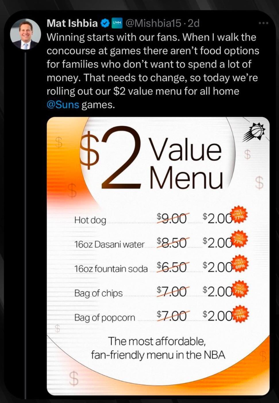 Phoenix Suns owner changes food prices at the stadium to $2. What’s the chances Jets owners ever do so thing like this, actually incentivize fans?
