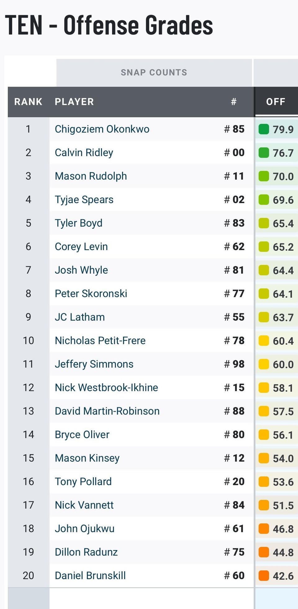 This was a great game from Latham and Skoronski. In addition to both getting an 80+ pass block grade, they combined for 0 sacks and 1 pressure allowed. That’s very encouraging for the future of our OL.