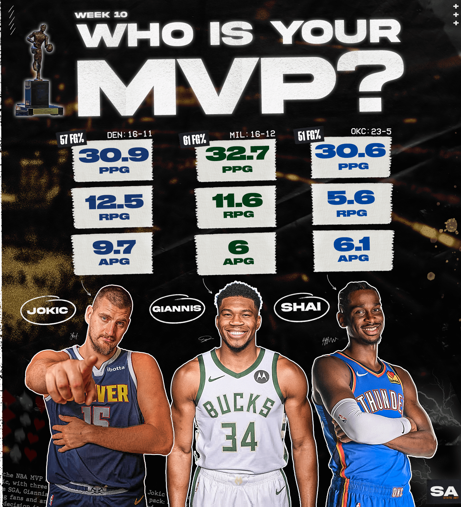 I think Giannis gonna win it if all 3 stay healthy. MVP burnout gonna hit Jokic voters and Giannis has been a 1 man army. I think it’s gonna come down to where the Bucks and Nugs finish in the regular season. Whichever team has the best record I think it’s gonna go to them.