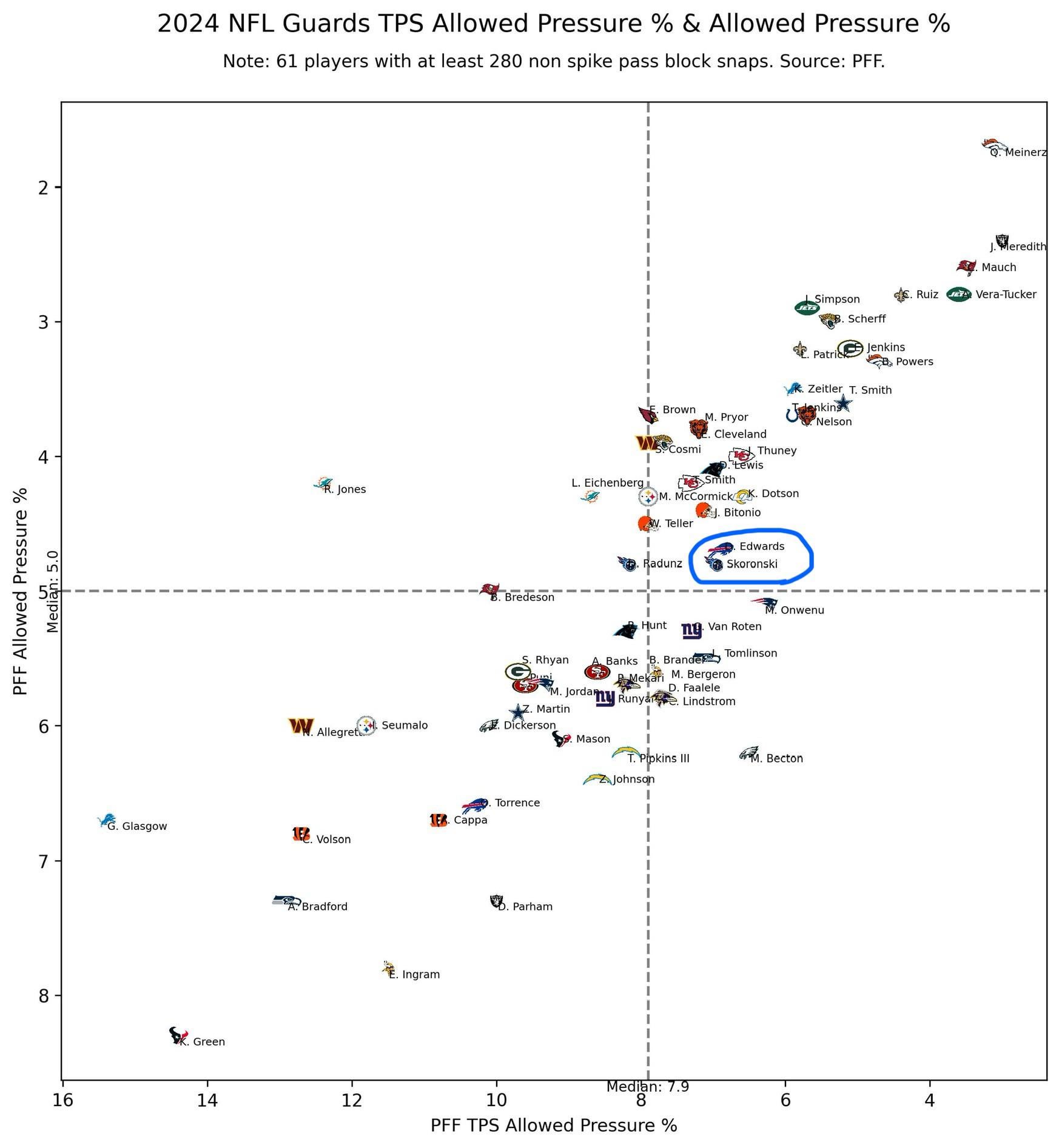 One year later, Skoronski has fully become accustomed to LG. Look at his pressures allowed chart: he has moved into the upper half among guards, and, most important of all, he is playing better and better throughout his second season.