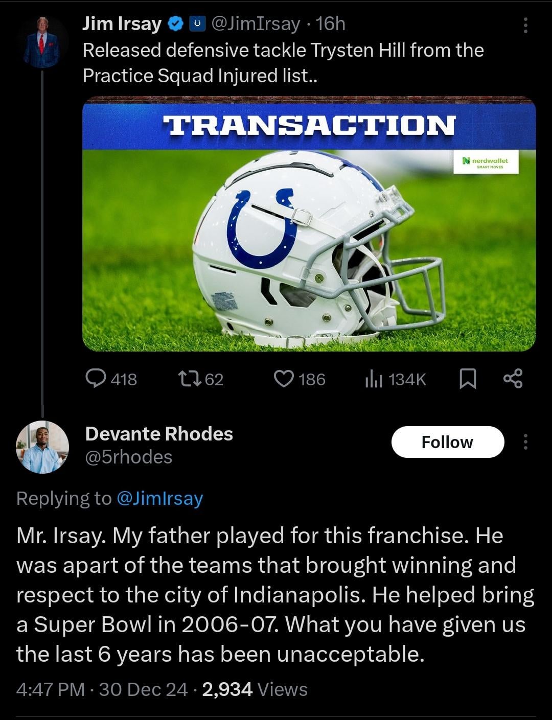 Son of former Colt, Dominic Rhodes, sounds off on Jim Irsay on X.