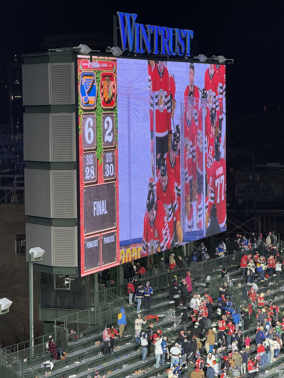 The Blues crushed the Blackhawks 6-2 today at Wrigley. It was amazing to be there and the Blues fans were louder than the hawks fans. When we would score the Blues fans in my section were counting the goals as if Towel Man was there. There was also confusion when most of the stadium screamed Bluuuuuuuuuuues at the end of the national anthem. Best thing ever!