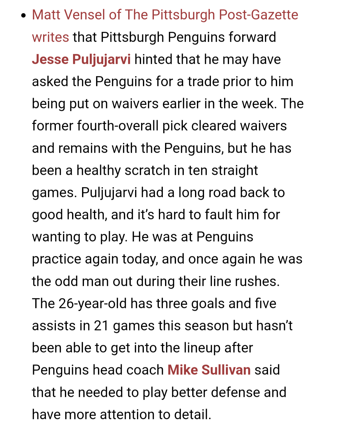 He blamed the Oilers for not getting a chance there, then goes to Carolina and they don’t want him back and now Pitt doesn’t want him. Wish him well but after a while gotta look in the mirror.