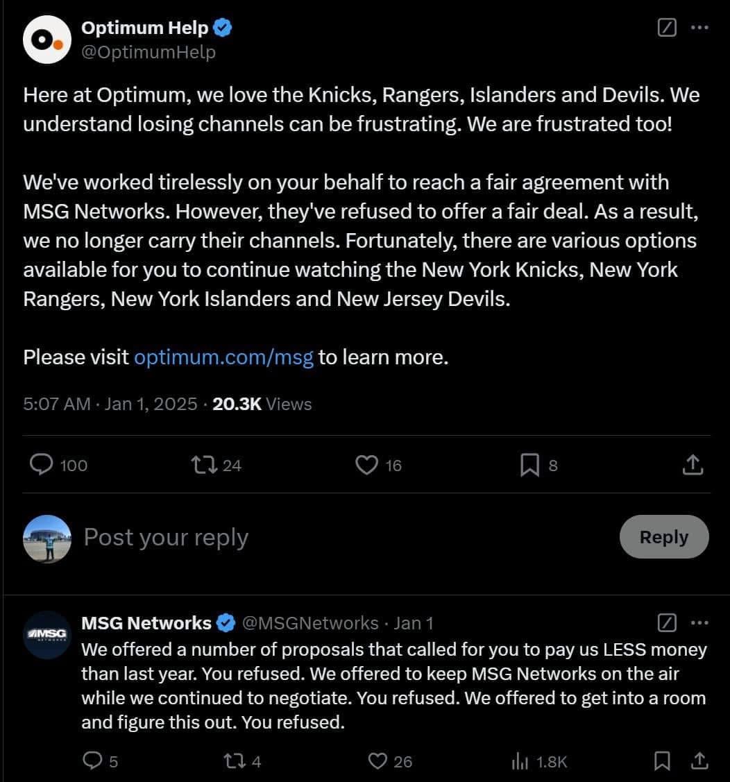 1. I don’t think we will be seeing MSG back on Optimum if this is true, and honestly it probably is. I feel like Altice is ready to kill off their tv packages and just focus solely on internet and mobile.