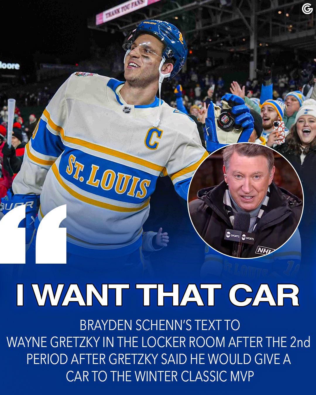 Here’s Wayne saying the story on set: [Wayne told the Blues that the Winter Classic MVP wins a car and that Wayne is the selection committee… After the 2nd Wayne said Brayden Schenn texted him saying he wanted the car](https://x.com/br_openice/status/1874264750491631965?s=46&t=Xn0juU2C4hEaElfmeGb4jQ)