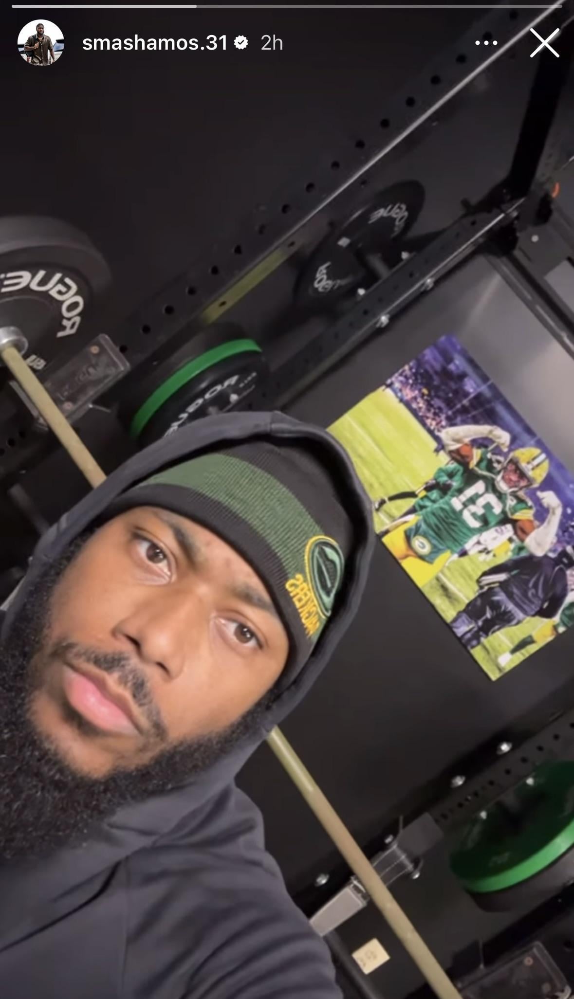 Former Green Bay Packers safety Adrian Amos posted an Instagram story wearing a Packers hat with a picture of him in a Packers uniform in the background.