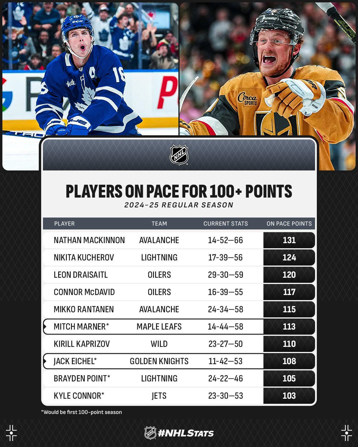 Ten players are on pace for 100-point seasons at the halfway mark. Marner, Eichel, Point and Connor are the four eyeing their first triple-digit campaign.