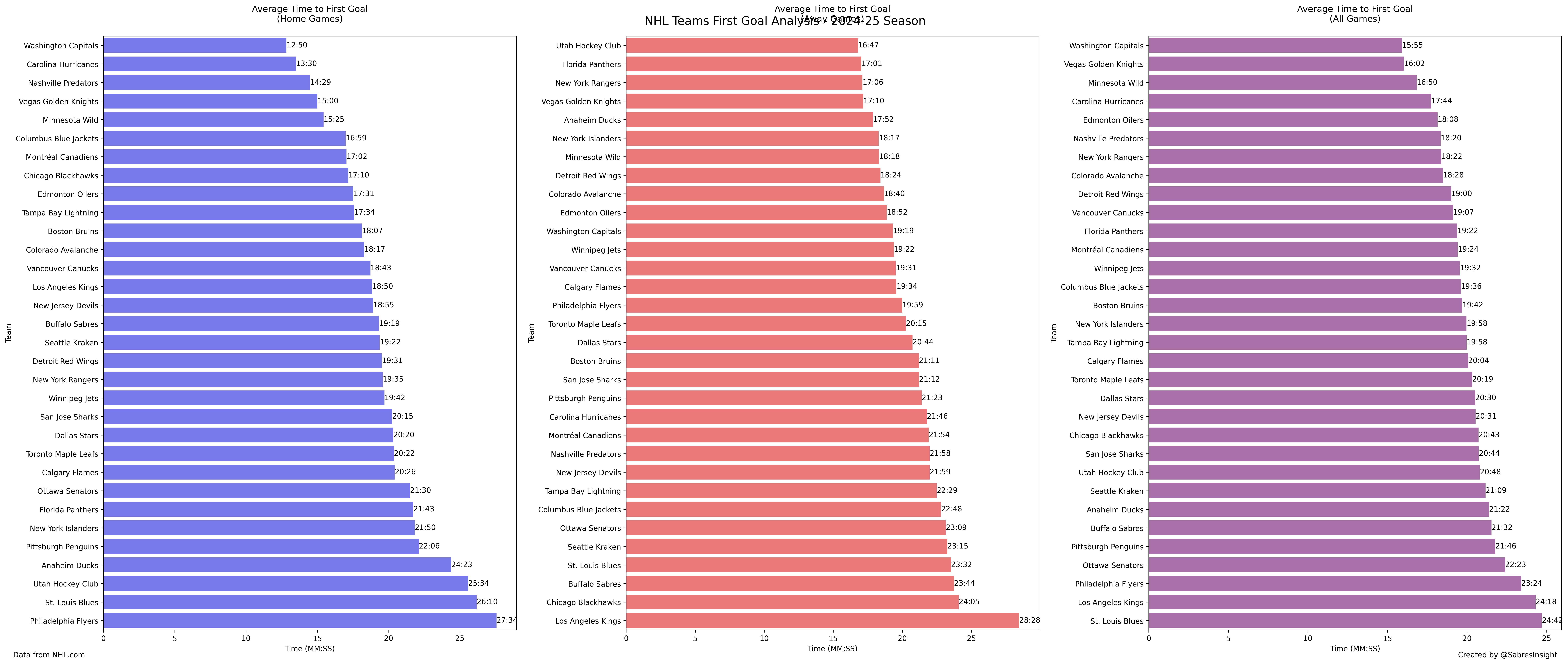 Average Time NHL teams like to score their first goal Home, Away and combined