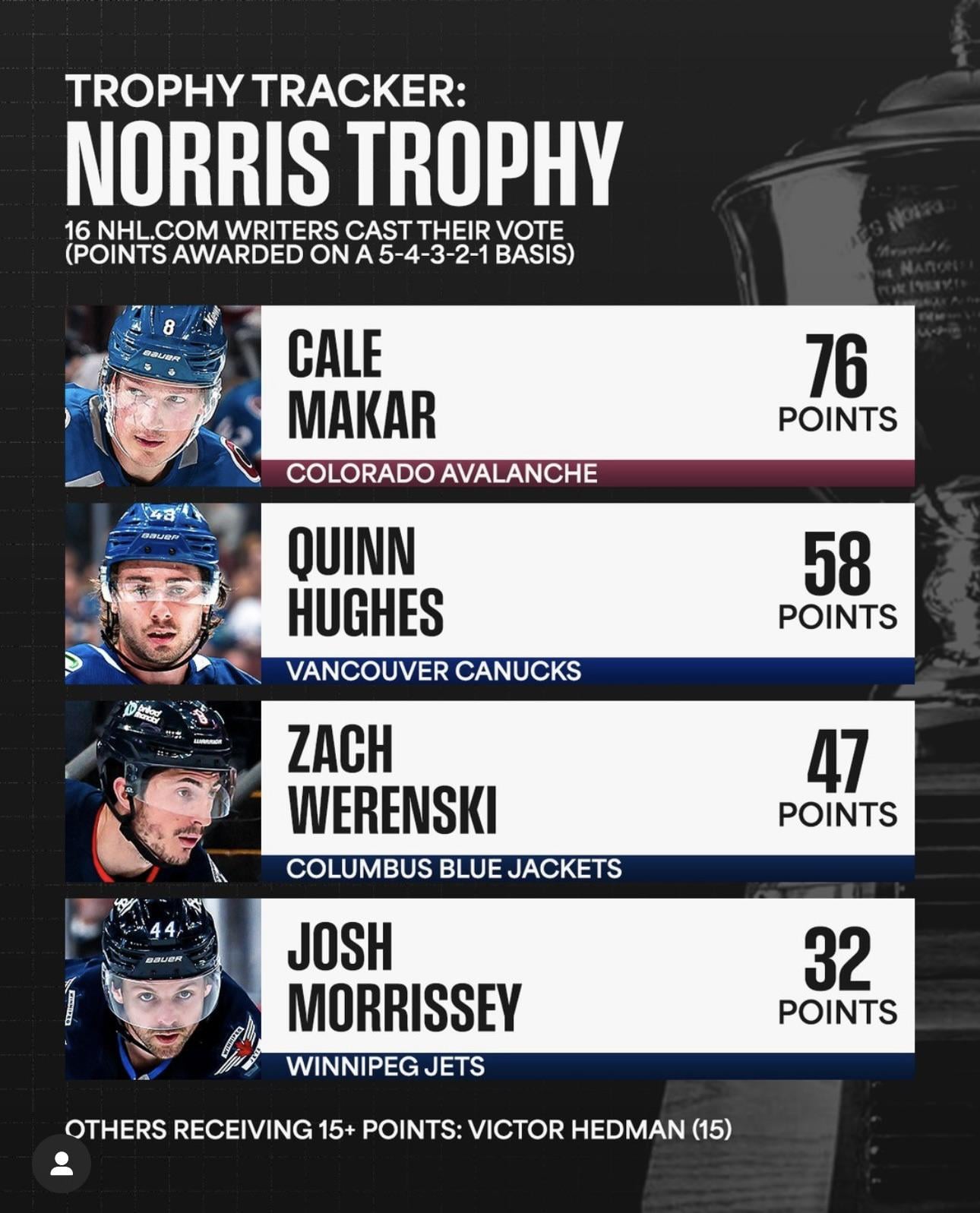 In a sense Werenski has more value to the Hart trophy if Makar is gonna pull away with points for Norris. Ik the Hart is for every player, but just looking at these 4 Werenski is definitely the most important to their team. Unfortunately Norris has mostly only been able to be won by being 1st or 2nd in D points