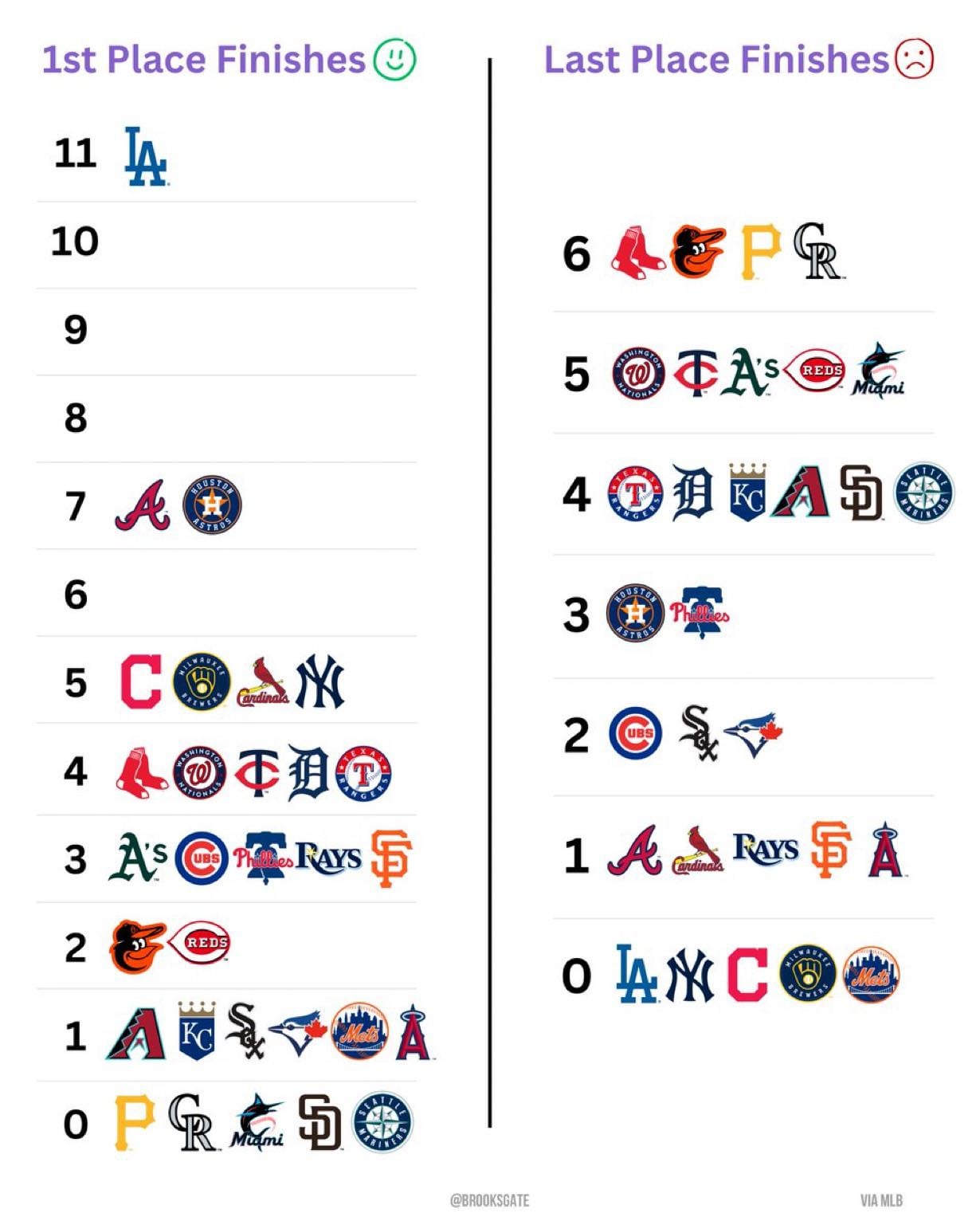 [BrooksGate] number of times each team has finished first and last in their division since 2010