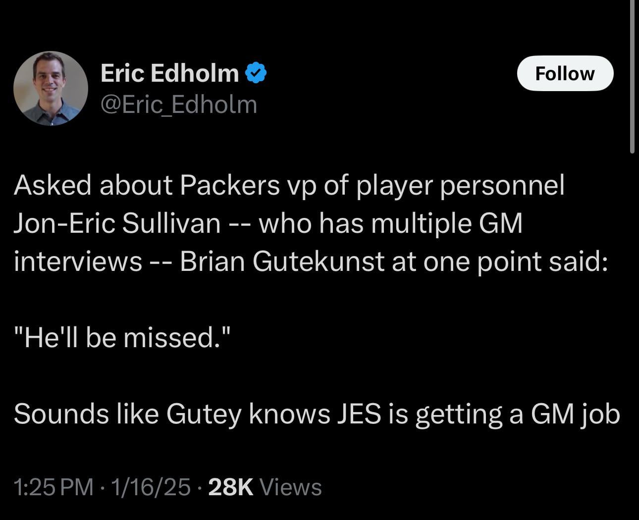1) JES didn’t pick JLo but I’m sure was influential for that pick for whatever that is worth to yall. He came up behind Gutey and every time Gute took a higher position JES was given the position that Gute just left this made them very close and respected one another. JES apparently only knows how to shoot straight and has been among the first and loudest voices calling out things in the front office whether that be personnel decisions or whatever. We as a whole Foster that environment but Gutey said JES embodies it the most.