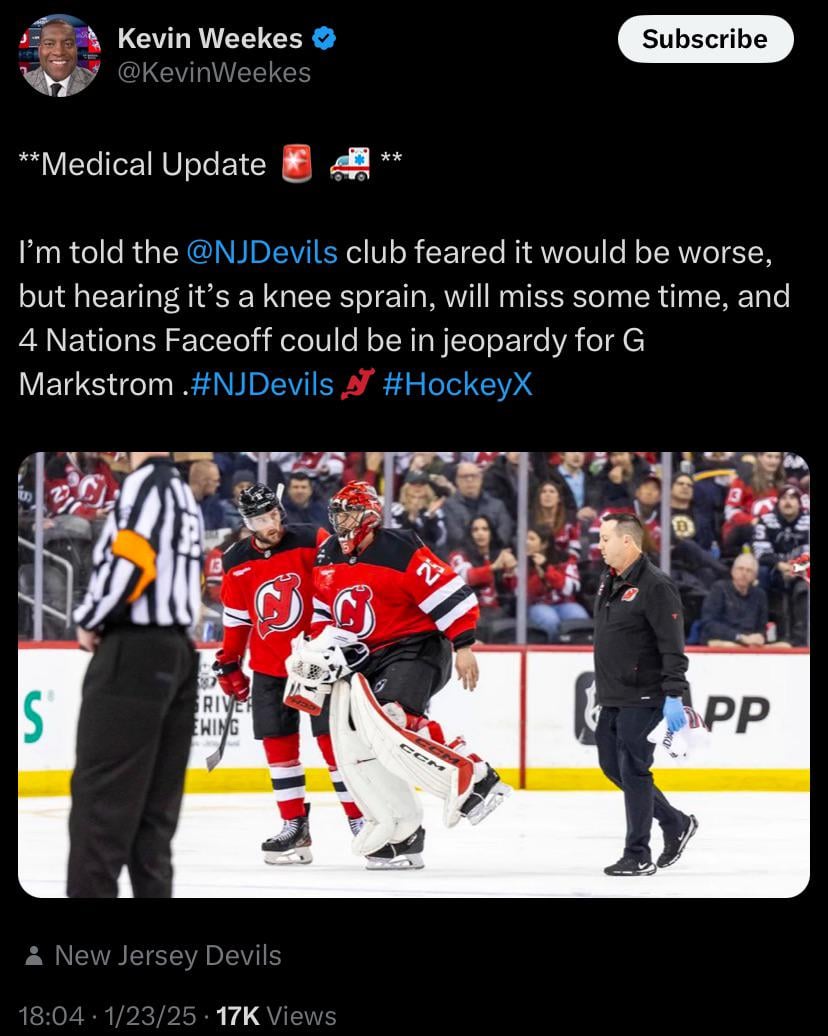 [Kevin Weekes on X: “**Medical Update 🚨 🚑 ** I’m told the @NJDevils club feared it would be worse, but hearing it’s a knee sprain, will miss some time, and 4 Nations Faceoff could be in jeopardy for G Markstrom .#NJDevils #HockeyX https://t.co/5tUrsqiF2B” / X](https://x.com/KevinWeekes/status/1882565028316114983?ref_src=twsrc%5Egoogle%7Ctwcamp%5Eserp%7Ctwgr%5Etweet)