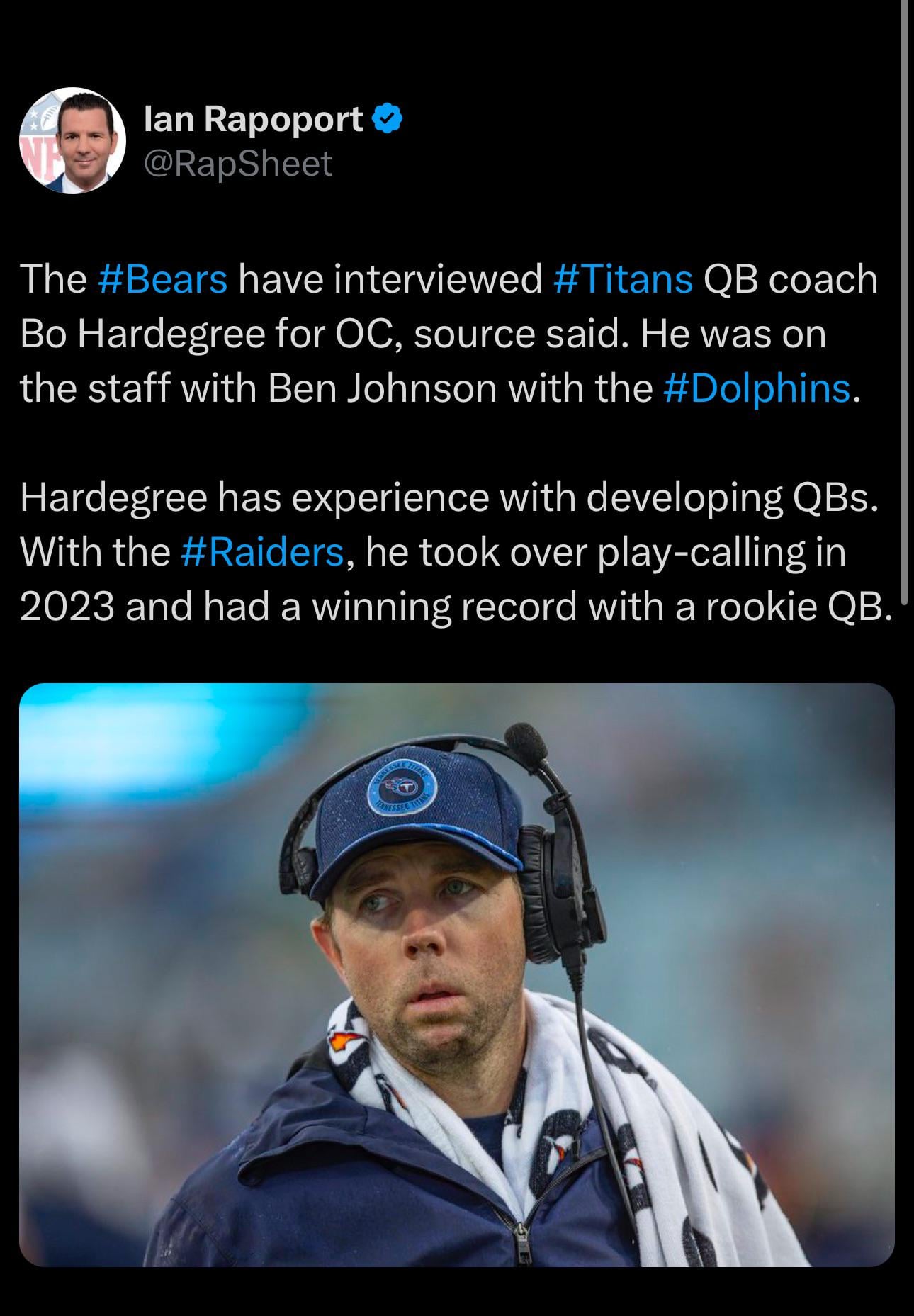 Titans QB Coach Bo Hardegree has interviewed for Bears’ OC opening