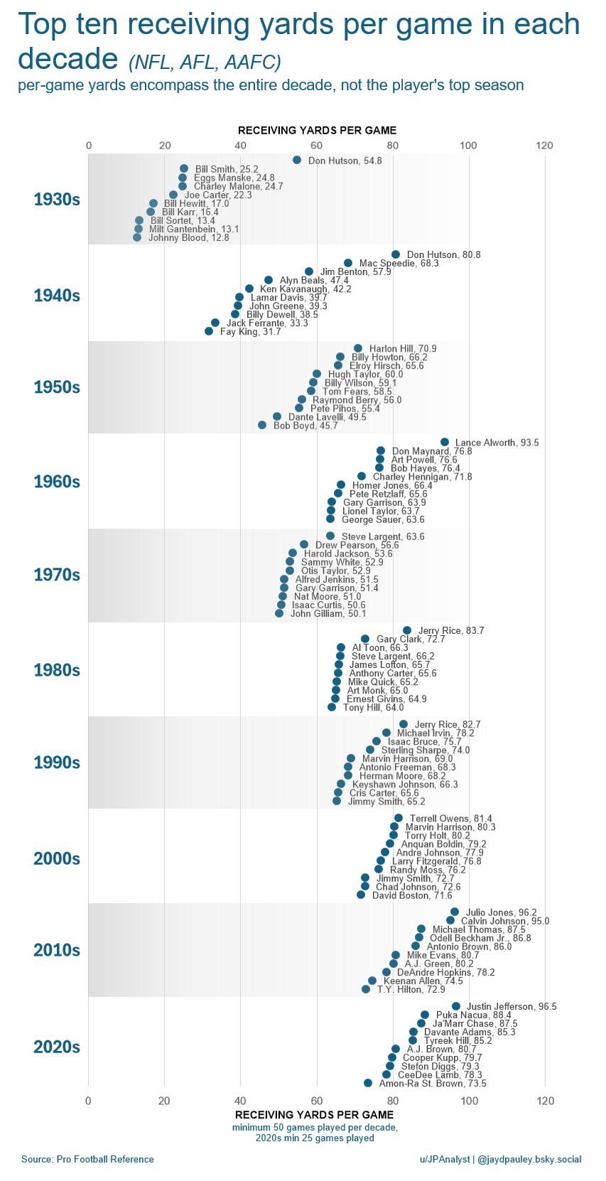 [crosspost] NFL top ten in receiving yards per game in each decade (American football) 5 comments JULIO JULIOOOO. R/toprightjulio He and Matty Ice need to be in our ring of honor. “JU AINT GOT NO BRAIN” YPG is the best WR stat, that list is bulletproof Alfred Jenkins sighting! Leave a ReplyYou must be logged in to post a comment.