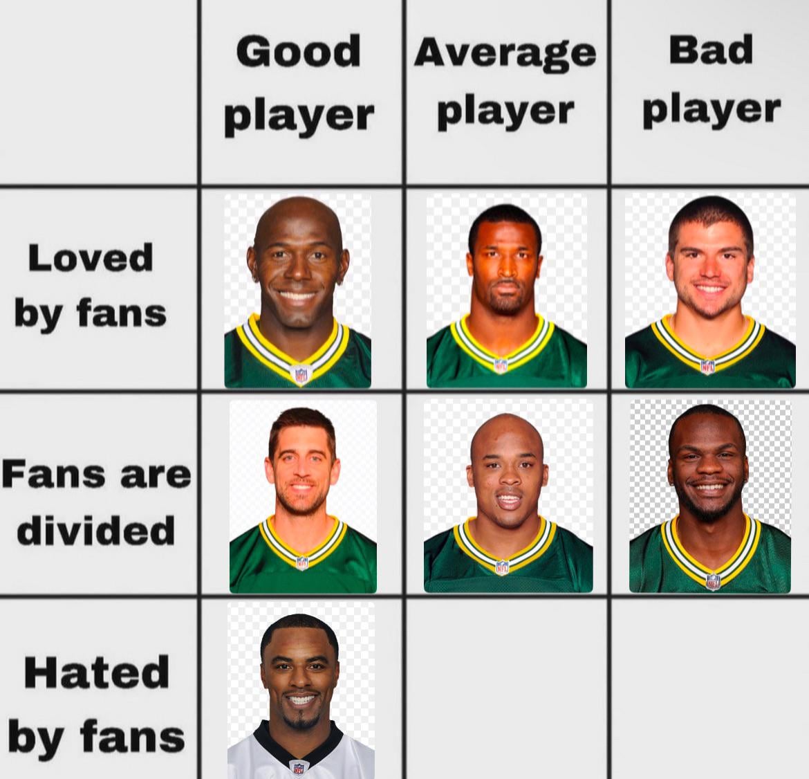 Bad Player/Hated by fans has to be Martellus Bennett. Has to be. MFer just quit on us because Aaron went down with an injury then faked an injury of his own during the bye week, was cut and then playing for the Patriots again the next week. F that guy so hard.