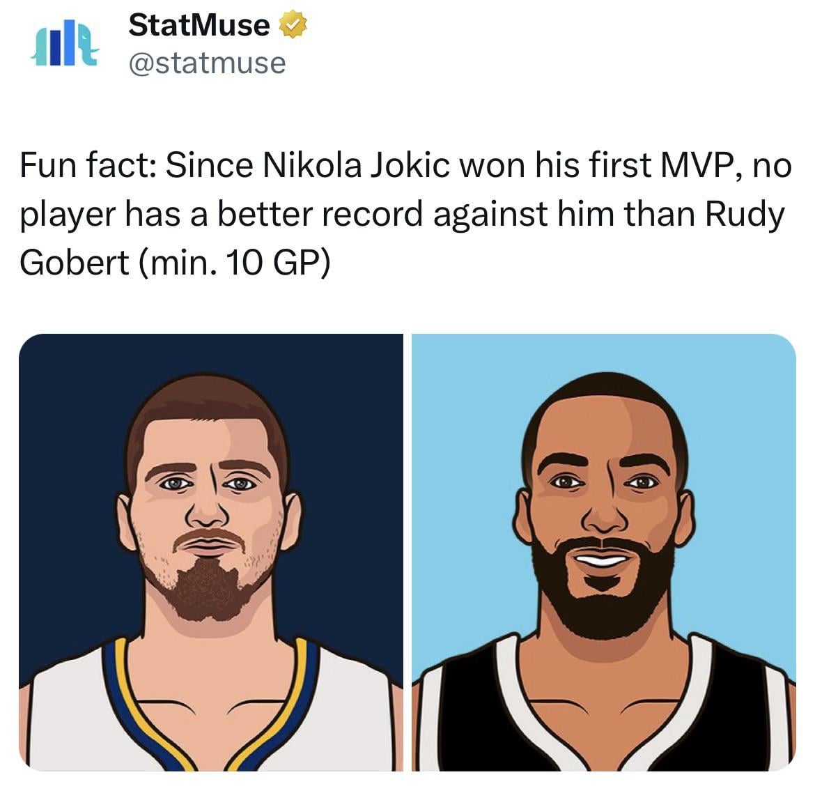 Understand this is two days after the game but I just came across this stat so thought I’d say this . Always thought the wider narrative that Jokic always cooks Gobert funny cos I don’t think a single centre guards him better than Gobert . I think it was further pushed after game 5 last year when Jokic was hitting just unbelievable circus shots on Rudy . The whole KAT being a very big reason on stopping Jokic, which was more prevalent amongst wolves fans too, was what was the funniest to me because he was only able to guard Jokic due to Rudy’s presence on the help that series.