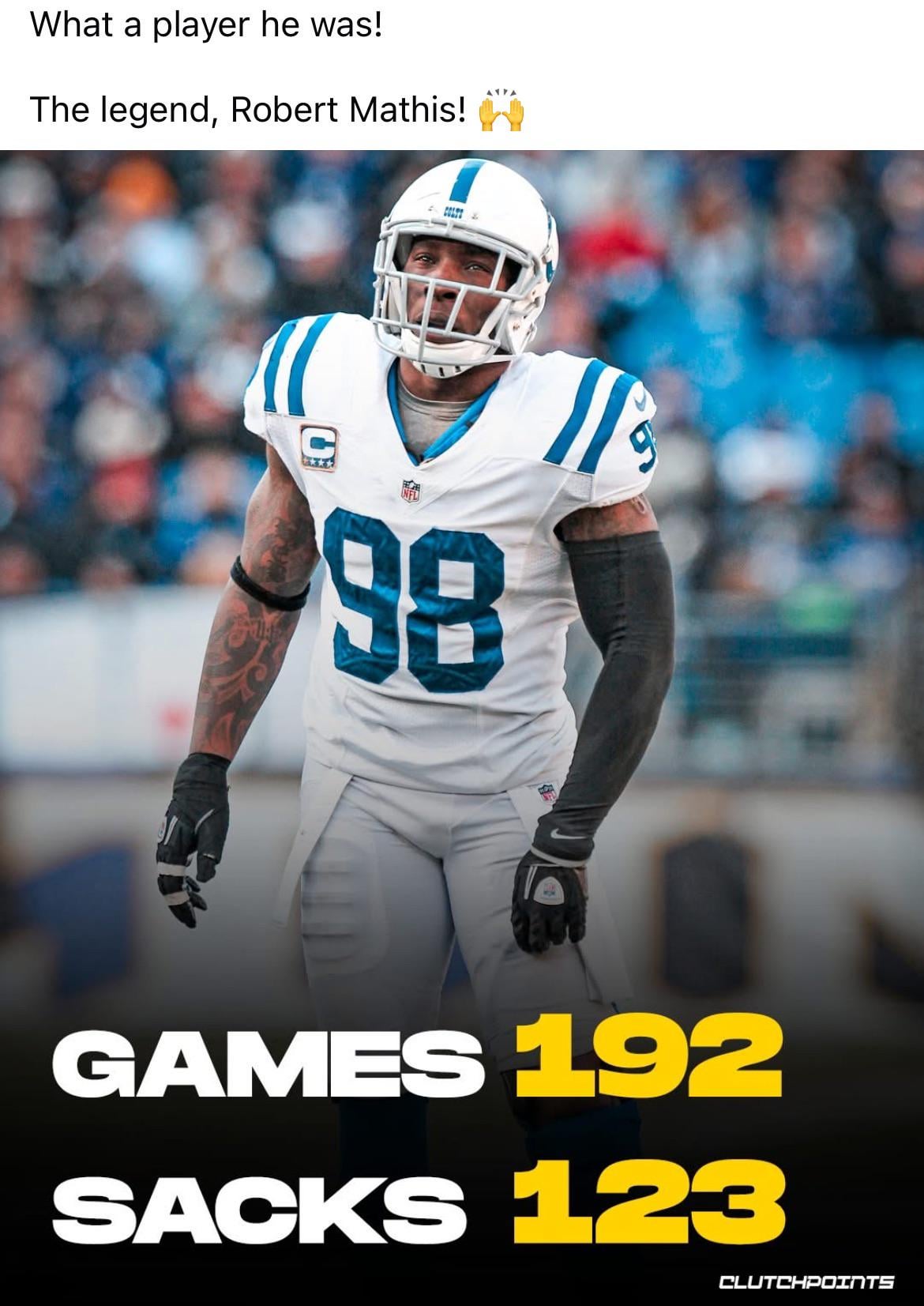 I remember his rookie player rating on the football game NFL 2k was something like 48 lol. Heck of a player, if Freeney didn’t get home then Mathis did, or vice versa.