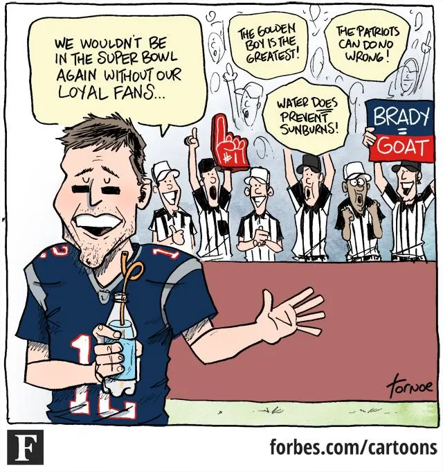 It was a similar story for the dynasty that Kansas City supplanted. For one example, the below cartoon appeared in Forbes after New England’s 2018 AFC Championship win over the Jaguars, which included a controversial pass interference penalty, among other flags. This is how the public viewed the Pats for large parts of two decades: