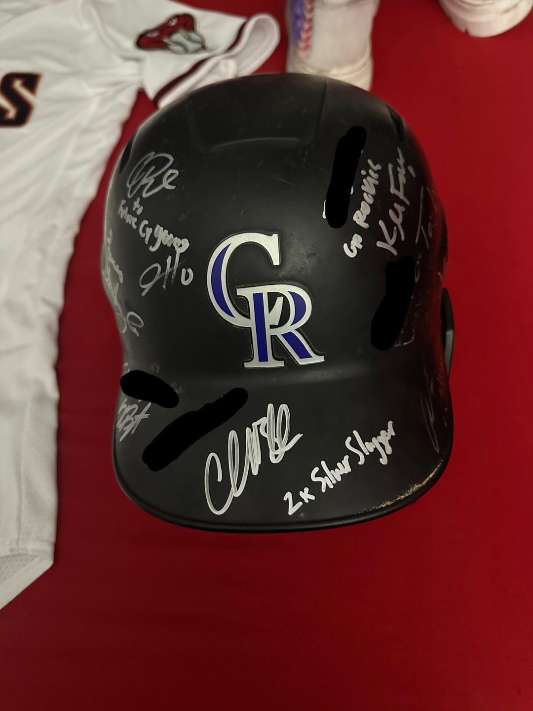 Helmet is signed by Charlie Blackmon, Kris Bryant, Kyle Farmer, Zac Veen, Chase Dollander, Aaron Schunk, Zach Agnos, Tyler Kinley, Drew Romo, Gabriel Hughes, Carson Palmquist, Jaden Hill, and Yorvit Torrealba
