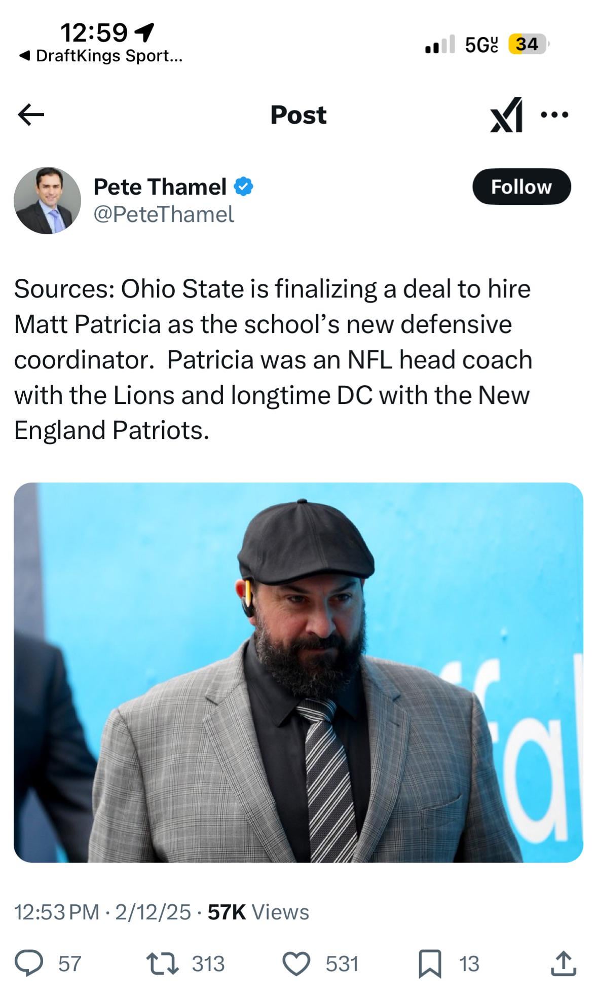Ohio State is finalizing a deal to hire Matt Patricia as the school’s new defensive coordinator
