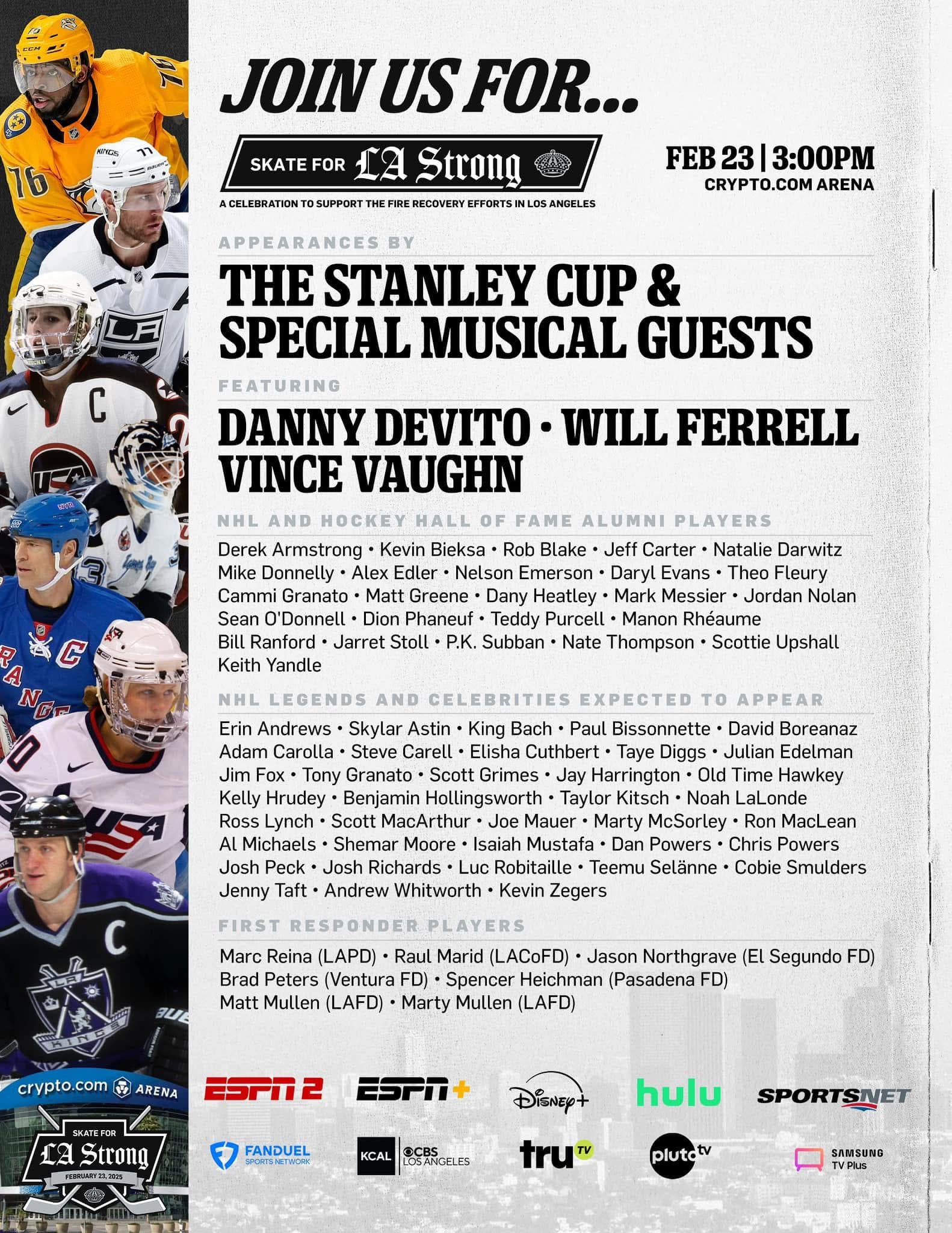 “The exhibition will feature four teams, consisting of 13 players playing in a single elimination format. Each teamβs roster will include a mix of celebrities, NHL Alumni and First Responders. Tickets for this event will be free to all Firefighters, First Responders, community group leaders, fire victims and their families as well as for Kings Season Tickets Members.”