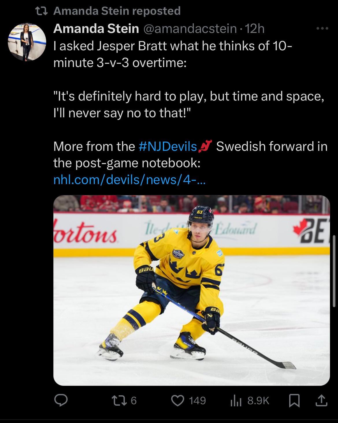 I asked Jesper Bratt what he thinks of 10-minute 3-v-3 overtime: “It’s definitely hard to play, but time and space, I’ll never say no to that!” More from the #NJDevils Swedish forward in the post-game notebook: