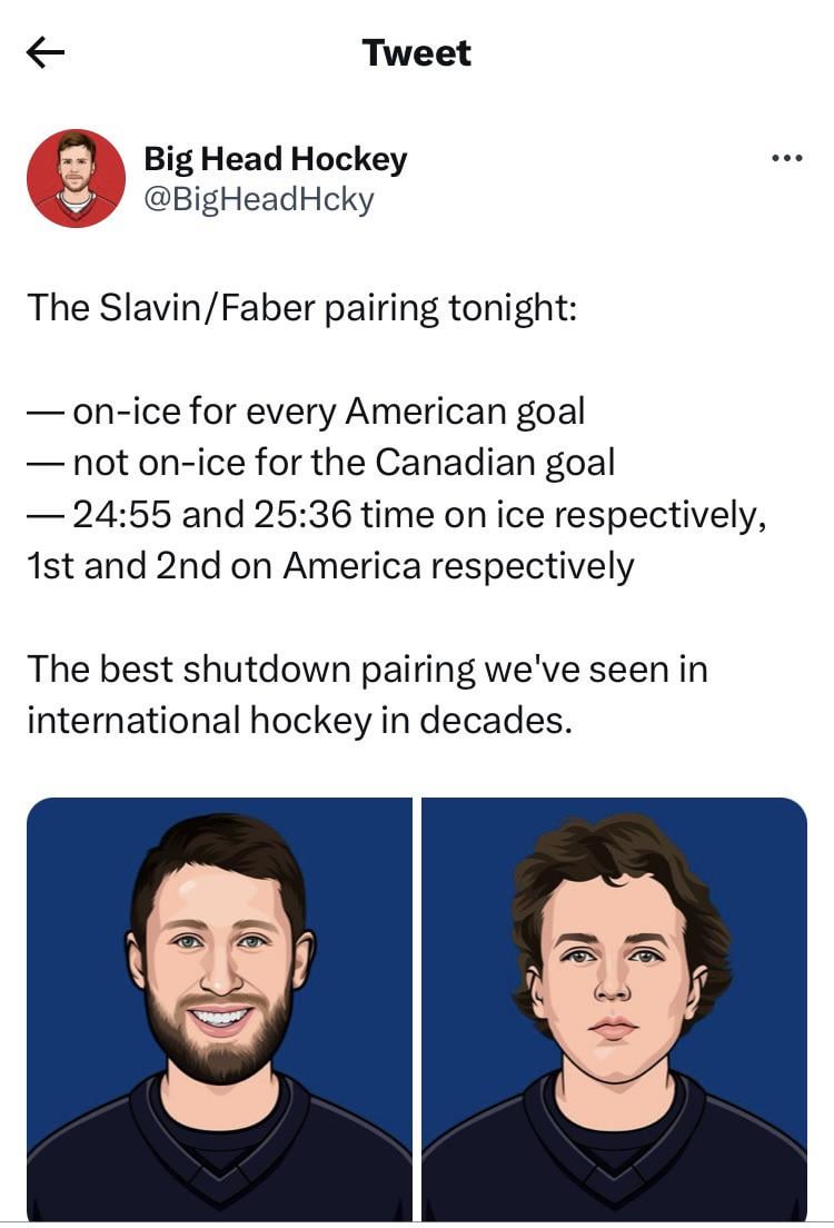 [Big Head Hockey] The Slavin/Faber pairing tonight: 3 comments This pair was outstanding and as much as I love Faber, Slavin was everywhere, definitely rocked the game I’ve been so giddy every time I hear Faber’s name. You know who’s not here … Bedard. suck it Can we have Slavin pls? Leave a ReplyYou must be logged in to post a comment.