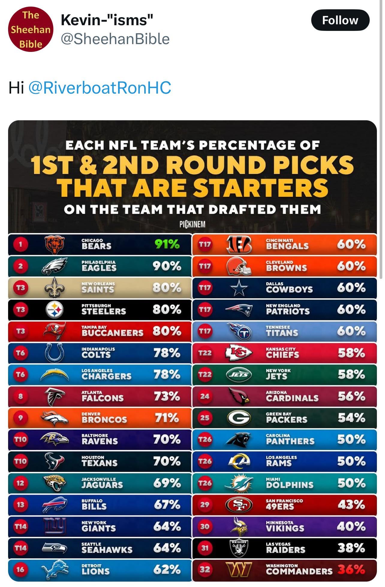 I don’t think 36% is right. I think it’s 33%. Of the 18 1st/2nd rounders still in the league (dating all the way back to 2010 Trent Williams), we start 6 of them: JD5, Sainristil, Quan Martin, Cosmi, Jon Allen and Daron Payne. 6 of 18 = 33%