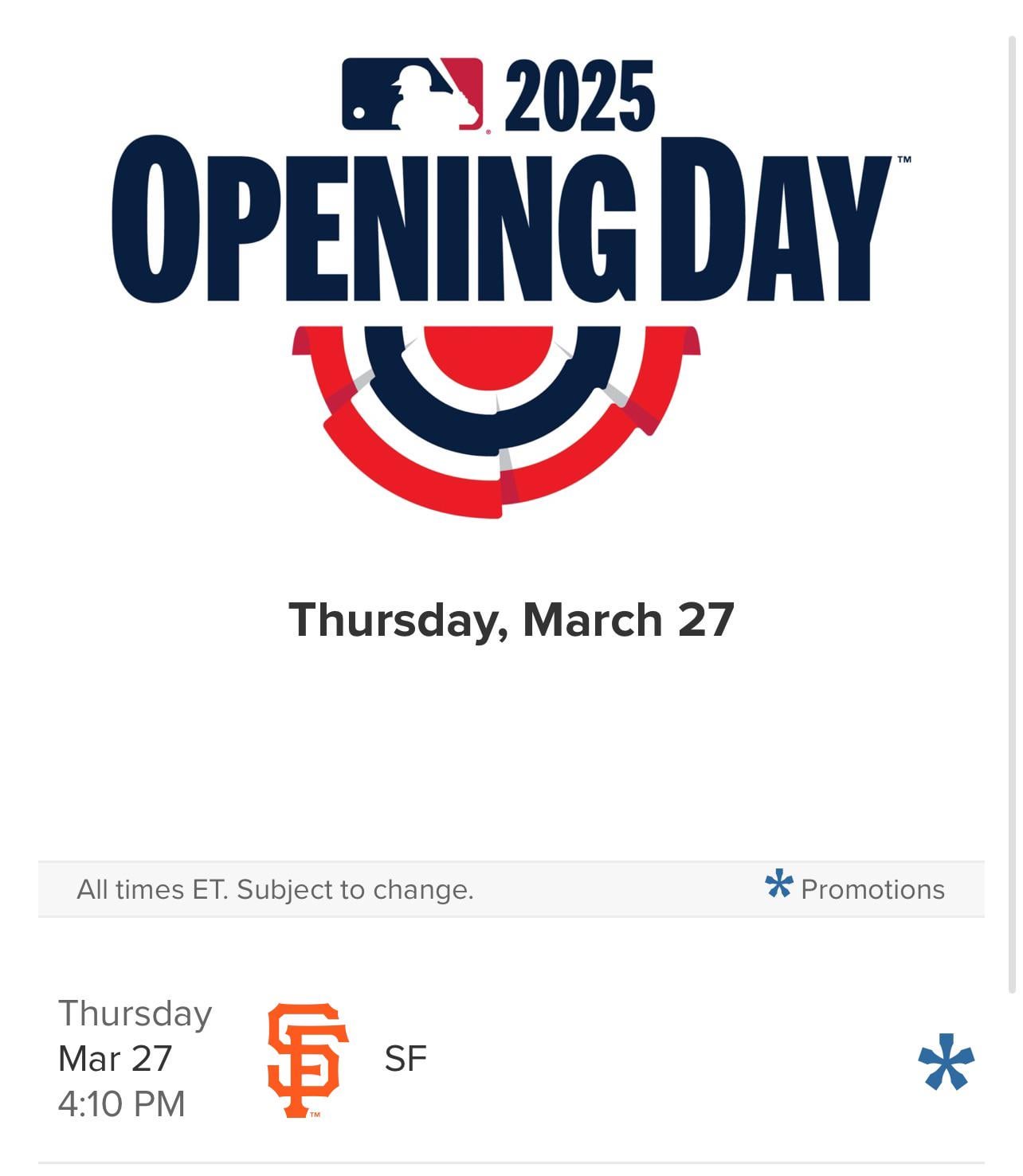 I’m not. I’m just taking the chance to say hello. I’m a newbie from the UK and this’ll be my first season as a Giants fan. Whilst I’m not making the trip for opening game, that will be my future plan – most likely when they next open at Oracle park. Let’s go Giants!