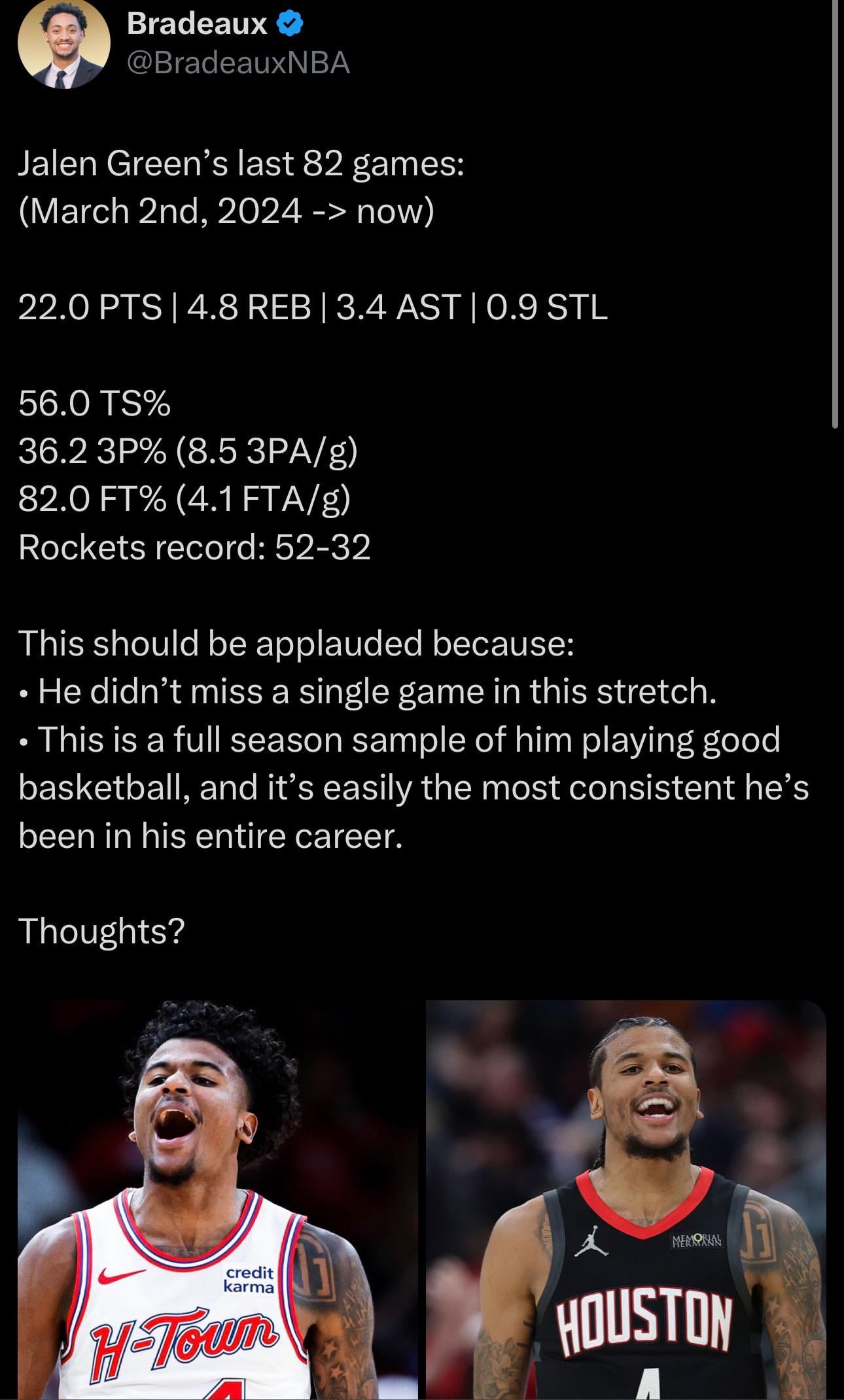 If he actually got a whistle he could easily average 27+ a night 4 comments I don’t like harping on one thing tooooo much especially when it’s regarding refs but it is completely asinine the kind of whistle Jalen gets. Now he just needs to take that next leap and be the guy that carries this team offensively in the fourth 56% TS would put him at around 266th in the league this season. Probably could have left that one out. Sengun is at 54% this season, and people are asking if he’s forgotten how to play basketball. And spring green is coming Leave a ReplyYou must be logged in to post a comment.