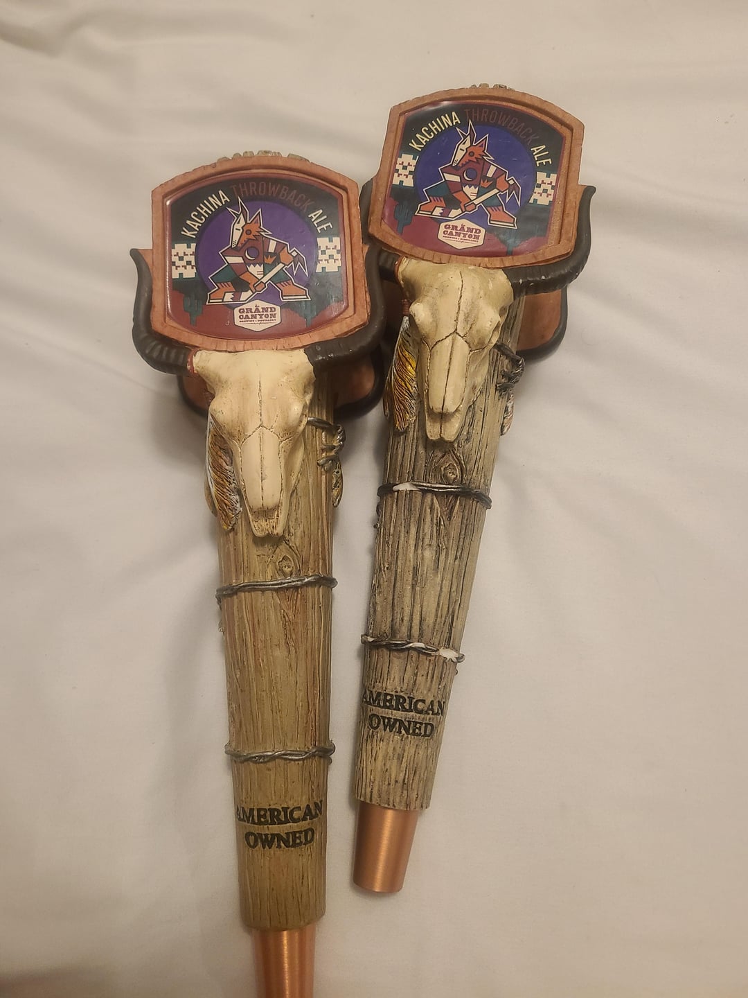 These are the beer tap pulls for the Kachina Throwback Ale from 2019. My husband works at a bar and they were going to throw these out. According to the brewery's website, it was "a brewery favorite and Grand Canyon's most awarded brew." They're a bit beaten up, but I still think they're pretty cool.