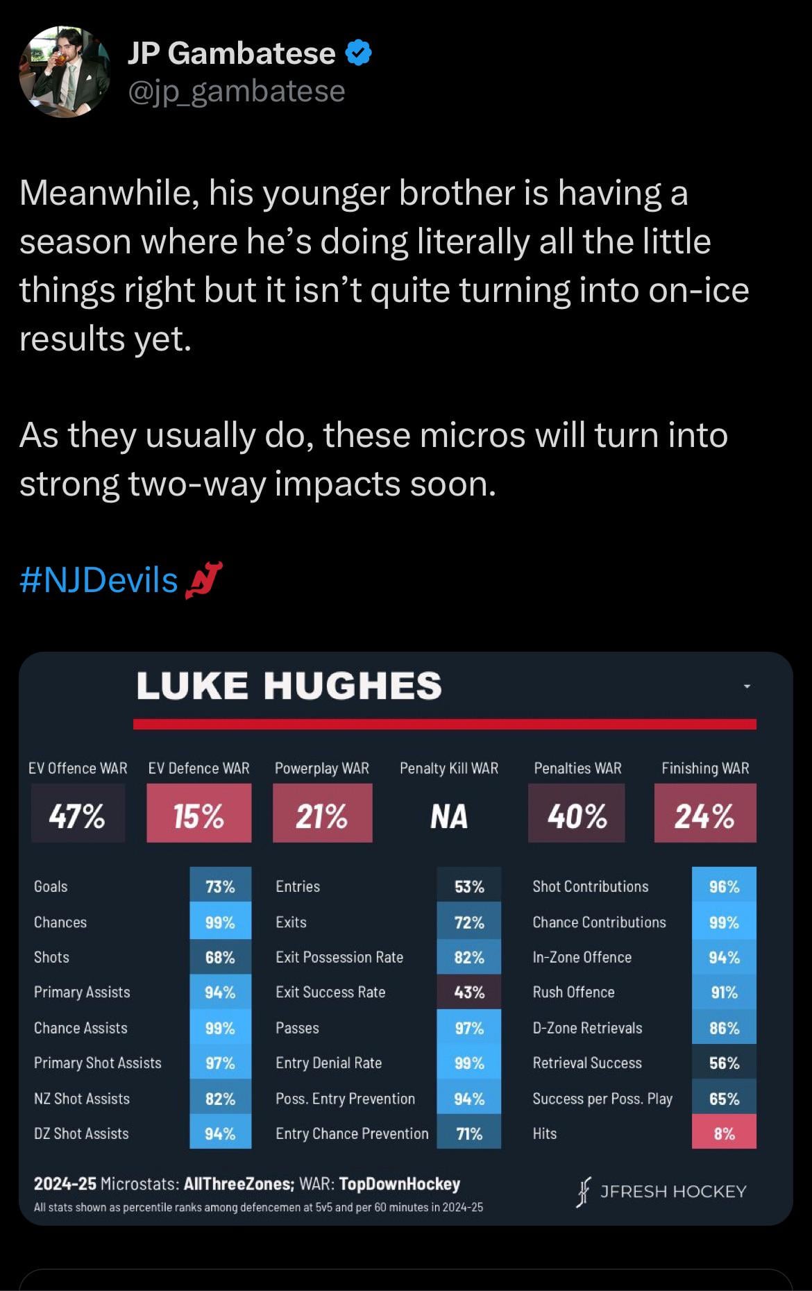 [Gambatese] Meanwhile, his younger brother is having a season where he’s doing literally all the little things right but it isn’t quite turning into on-ice results yet. As they usually do, these micros will turn into strong two-way impacts soon.