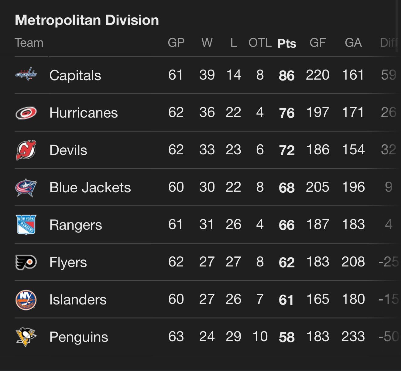 Blue Jackets and especially the Rangers have tougher schedules than us the rest of the way. Rags schedule is a 20 game gauntlet and we get the Jackets 2 times so we gotta take care of our business there