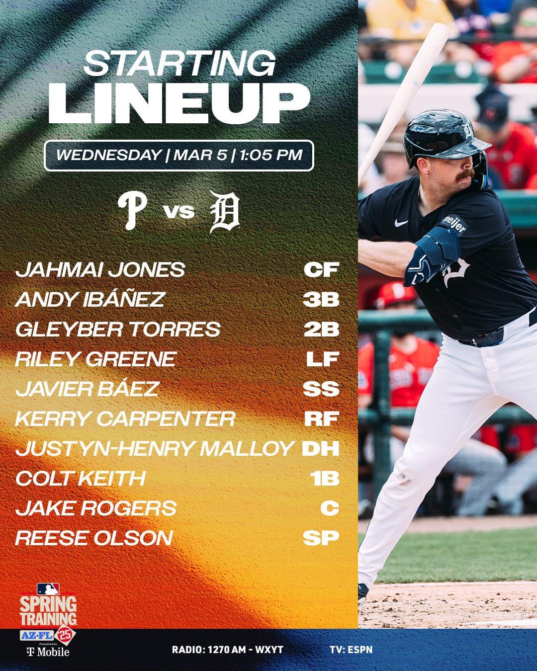 Detroit Tigers’ starting lineup for today’s game against the Phillies! 3 comments Ugh, I have a meeting at noon (1pm EST) Espn should be showing the game per their listing but it’s the Pat McAfee show instead 😢 Anyone else having problems with the MLB app audio feed? Leave a ReplyYou must be logged in to post a comment.