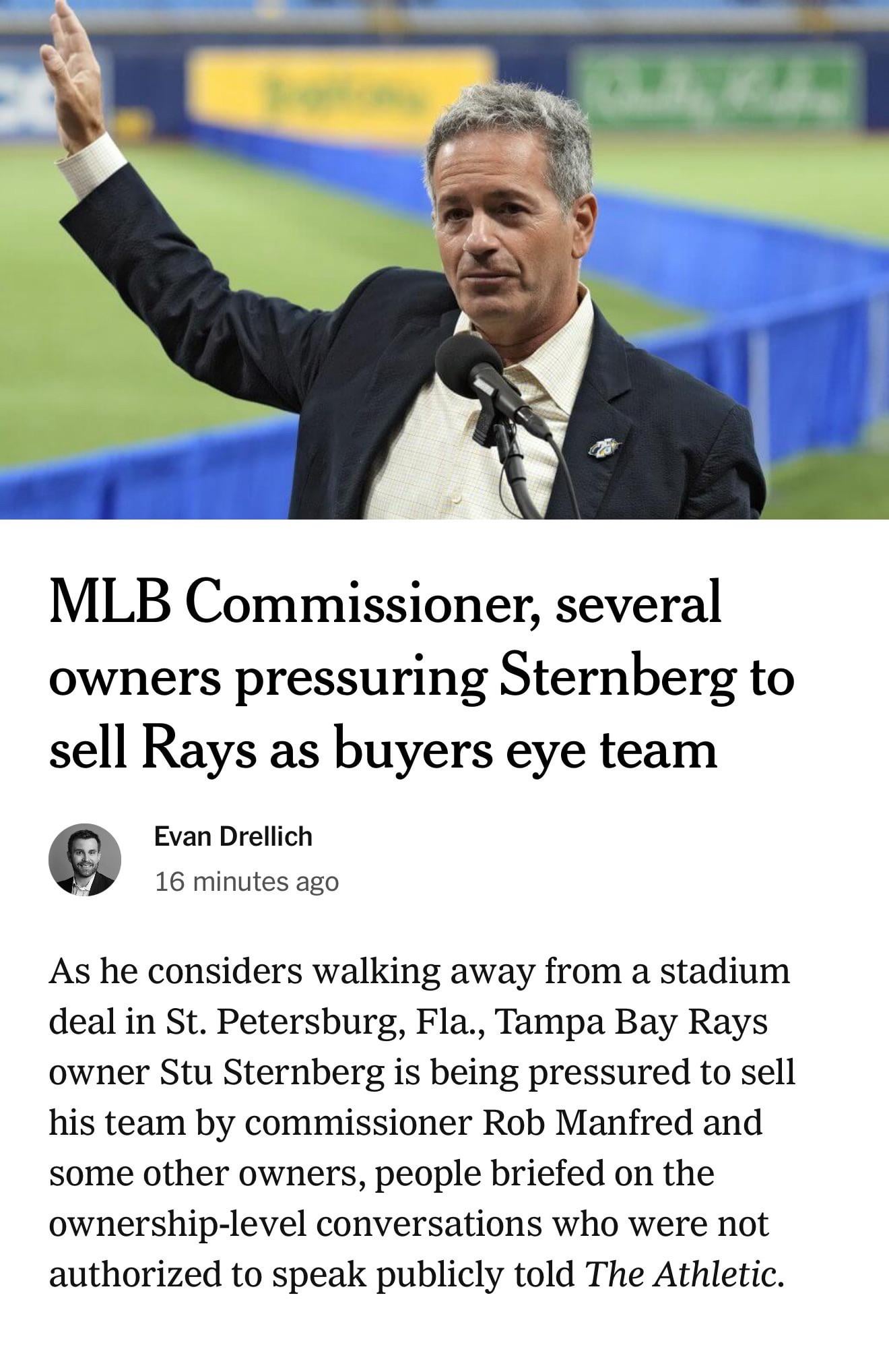 I dunno–the ongoing ballpark kerfuffle in St. Pete is a much larger issue for the league; it means lower gameday revenue for the team (so less revenue for MLB overall) and is a black eye for the league along with the Sacramento A’s situation. Sternberg’s had years to figure this out and gotten nowhere, so it’s probably time for him to go.