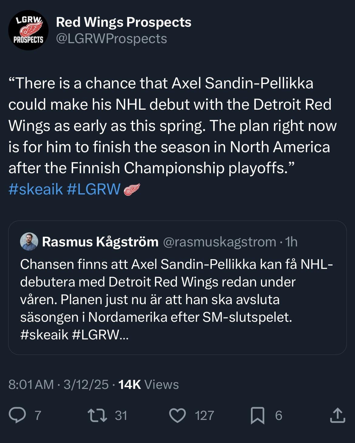 [LGRW Prospects] There is a chance that Axel Sandin-Pellikka could make his NHL debut with the Detroit Red Wings as early as this spring. The plan right now is for him to finish the season in North America after the Finnish Championship playoffs. #skeaik #LGRW