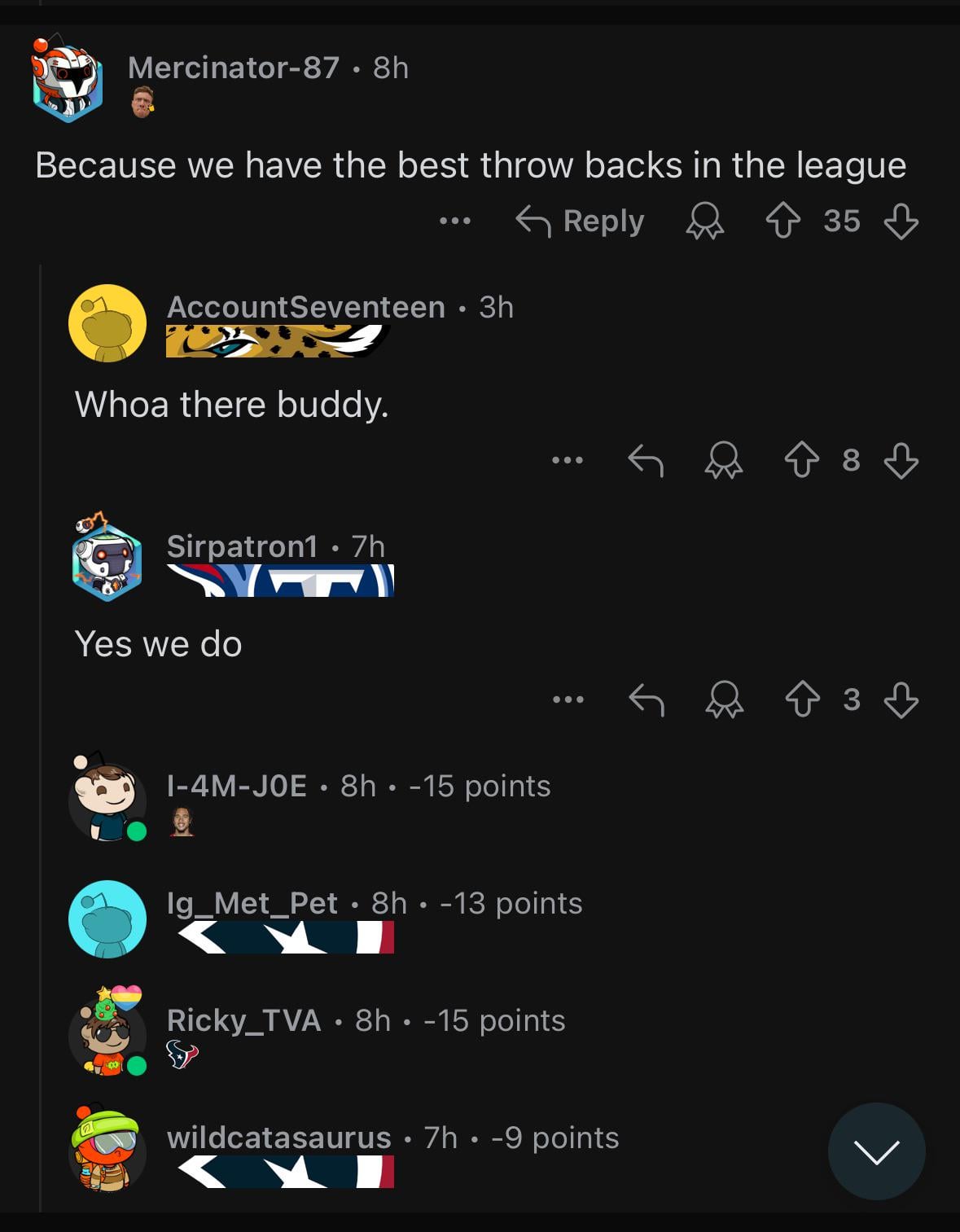 I mean, Houstons throwbacks aren’t bad, like if they go with the red ones from the JJ Watt era, but like if you’re going with their original designs frim like the 03-10 era as the throwback, they kinda suck. I get that it’s the TX flag colors, but it doesn’t look good as a uniform