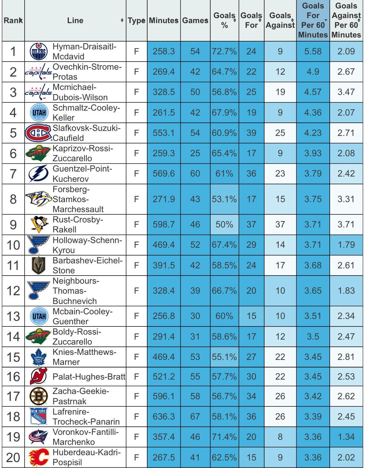 [Moneypuck] Top lines this season by goal scoring rate. (Minimum 250 minutes played together)