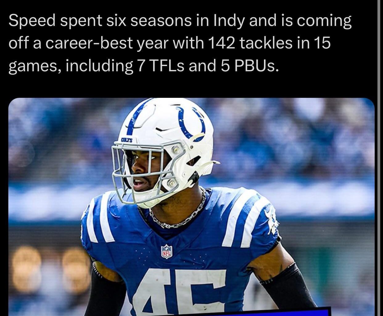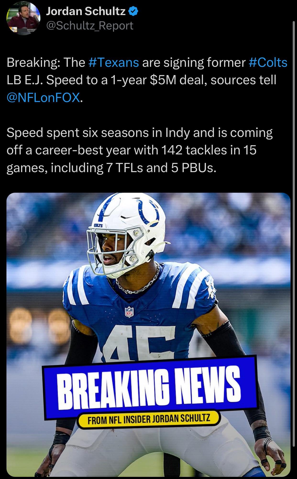 Texans sign former Colts LB E.J. Speed to a 1 yr deal