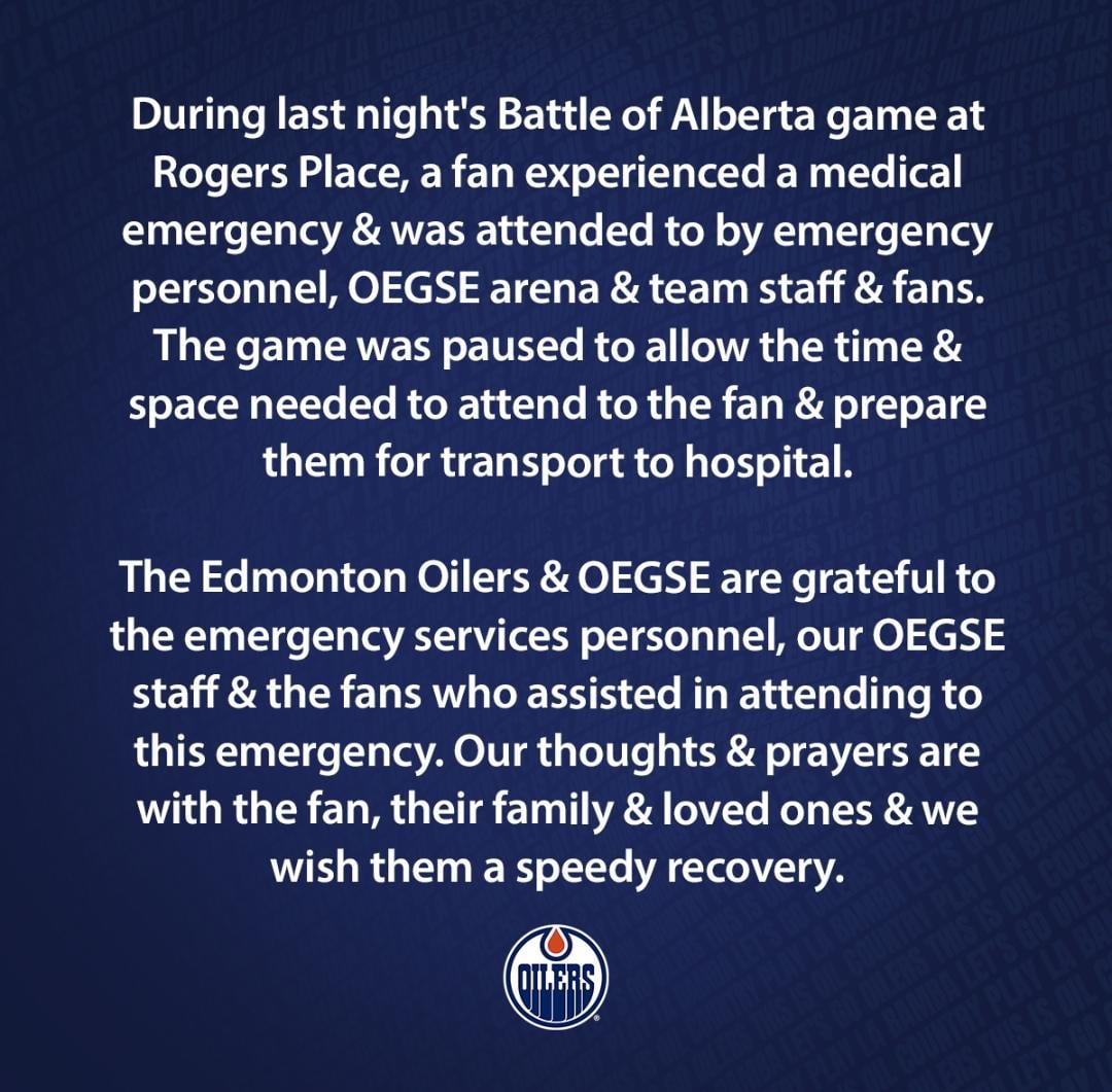 Statement re: the medical emergency during last night’s #Oilers vs. Flames game.