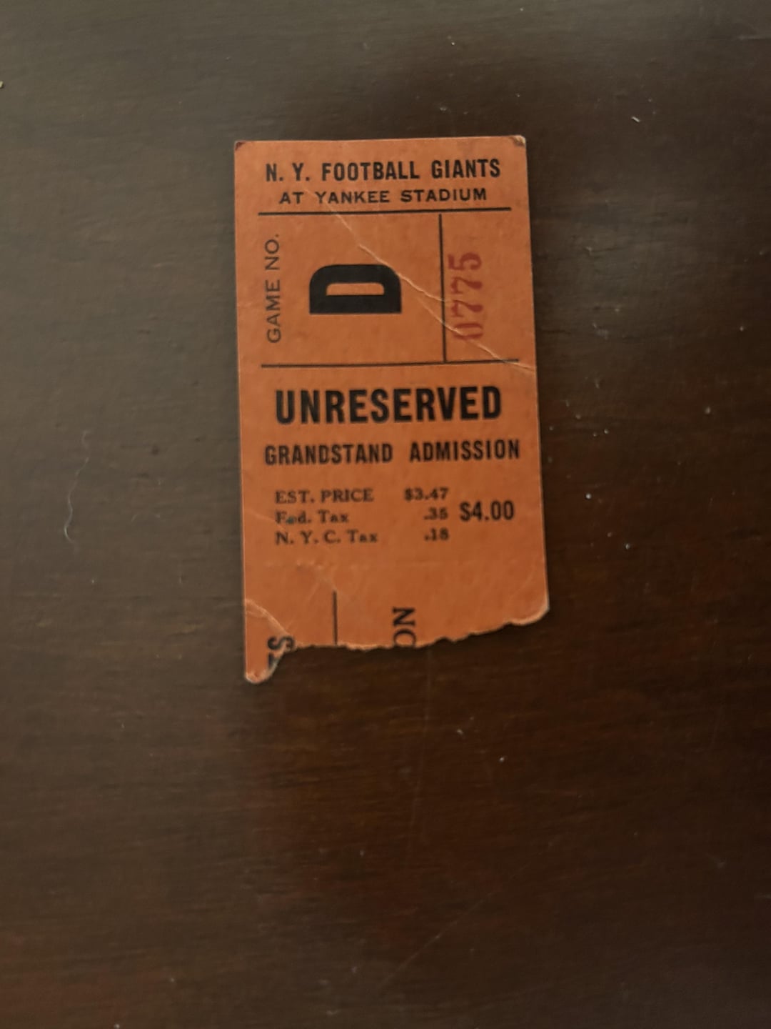 Given the characteristics of your Dad’s ticket stub—marked as “Game No. D” and for an unreserved grandstand admission priced at $4.00—it is likely from one of these games. The specific game can be pinpointed by cross-referencing the “Game No. D” designation with the Giants’ home game numbering system from that era.