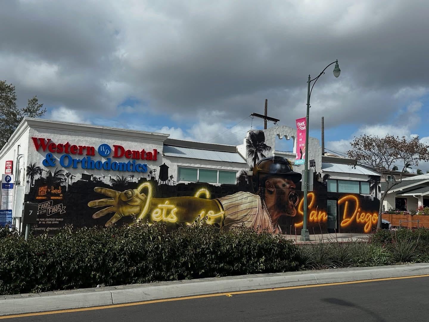 Don’t get me wrong, I really like the murals around town — HOWEVER, I would love to have some/many/a TON of them along the walls visible from the green line trolley ride south to Petco Park from Old Town. It’s a great opportunity for exposure to the art/artist/Padres. And an opportunity to cover up some of the ugly tags that are there now.