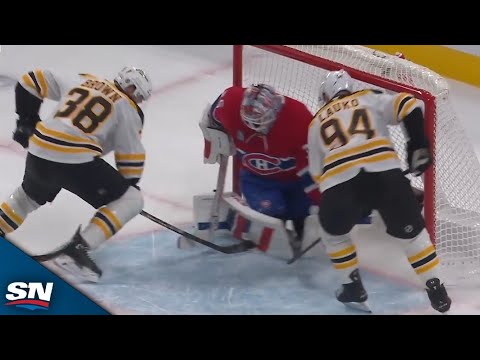 Watch as the Montreal Canadiens and Boston Bruins break out in a heated exchange after Patrick Brown and Jakob Lauko attempt to shove a puck in the pads of Samuel Montembeault into the net on a fast break opportunity.